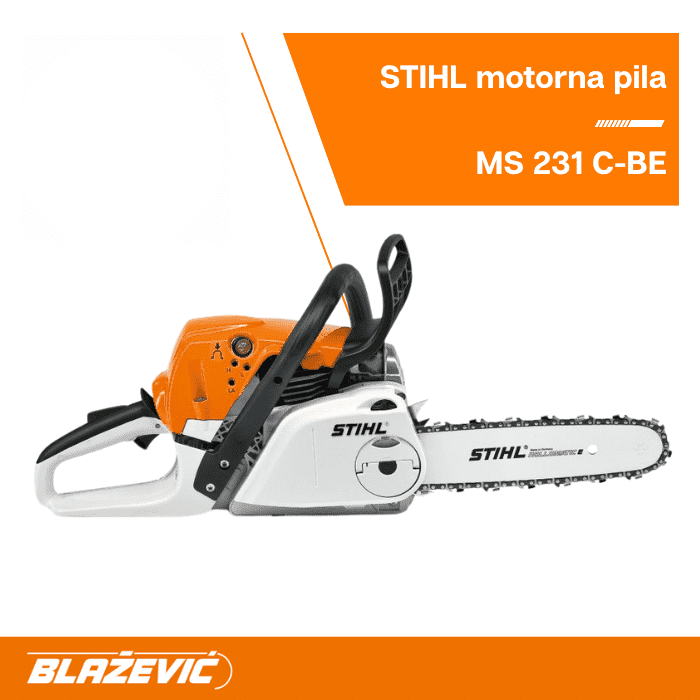STIHL MS 231 C-BE je kompaktna motorna pila snage 2,0kW pila s brzim zatezačem lanca i ErgoStartom (E), te serijski opremljena vodilicom duljine 40 cm. Do 20% manja potrošnja goriva i smanjenje emisije ispušnih plinova do 70% u odnosu na ostale motorne pile iz navedene kategorije dvotaktnih motora. Motorna pila optimalne vodljivosti i jednostavna je za korištenje. Idealna za uređivanje okućnice.